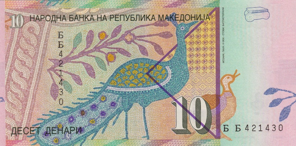 As you flip the banknote you’ll notice a colorful peacock. It’s a detail from the floor mosaic from the baptisteries of the Episcopal Basilica in the ancient city of Stobi. The peacock, a bird of the paradise, drinking water from cantaros (the source of life) symbolizes the believers craving for the Christian religion, mental peace and tranquility. The same mosaic fragment is engraved on the reverse side of 10 denars coins that were introduced in 2008.