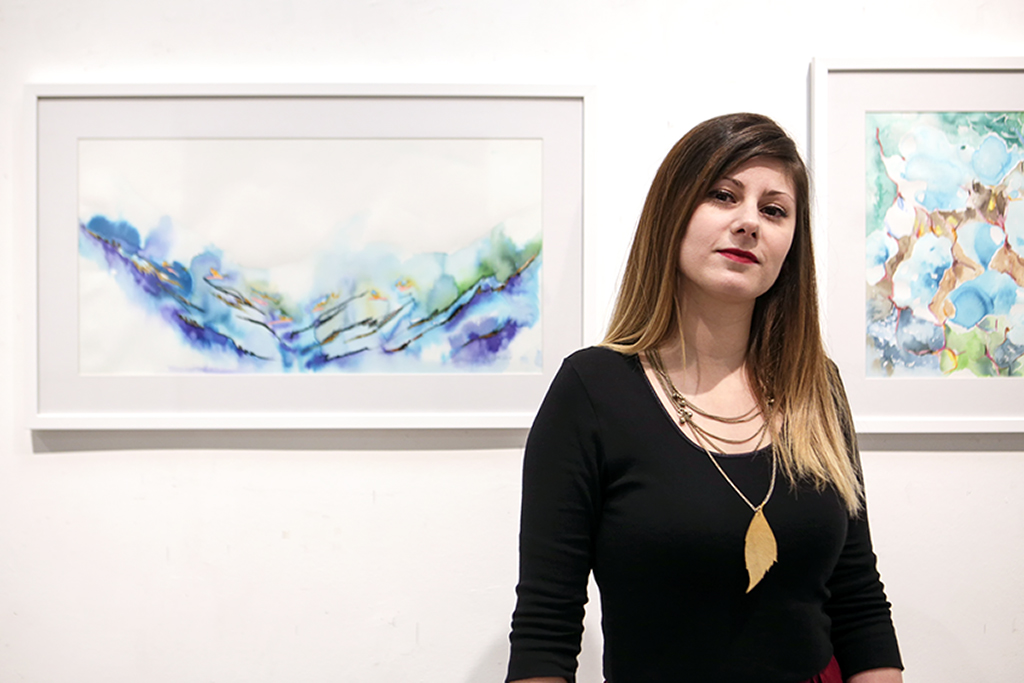In the period from 17th February to 6th March 2017, this young artist has set her fourth solo exhibition of watercolors at the Museum of the City of Skopje. Under the title “The play of the water”, through the presented watercolor paintings are intertwined various elements from figurative to abstract forms. These paintings carry a story that is represented by objects, motifs and characters that reflect feelings.