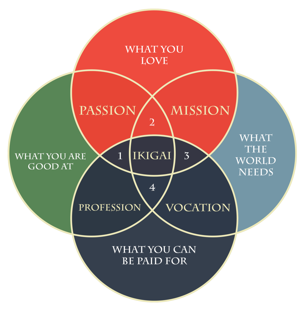Ikigai, consist of 4 questions and their intersection. The questions are “What you love?”, “What the world needs?”, “What you can be paid for?”, “What you are good at?”. The intersection point of “What you love?” and “What you are good at?” will be you passion. The intersection point of “What you love?” and “What the world needs?” will be your mission. The intersection point of “What the world needs?” and “What you can be paid for?” will be your vocation. The intersection of “What you can be paid for?” and “What are you good at?” will be your profession. The lack of an answer of the questions will lead some negative effect in your life.